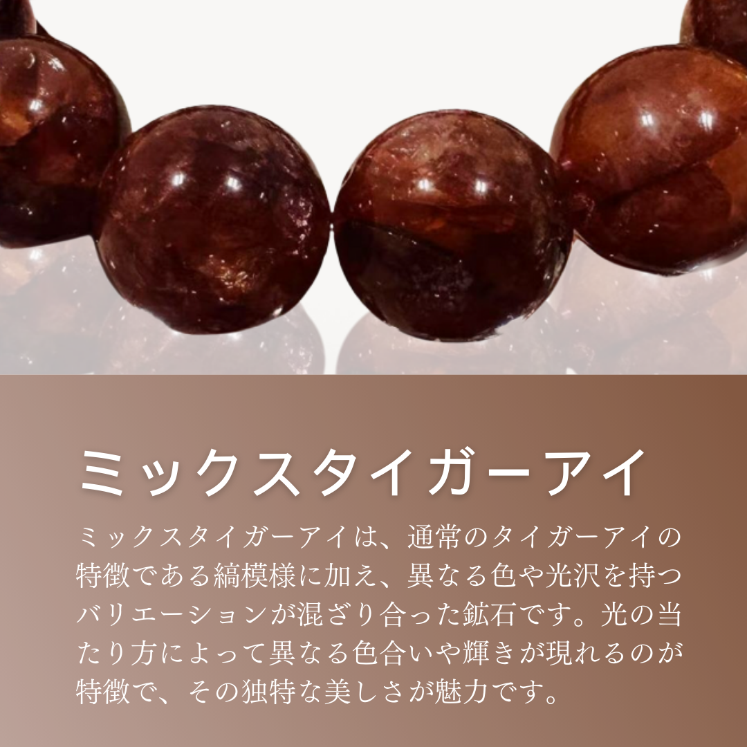 ミックスタイガーアイは、タイガーアイの伝統的な意味合いを持ちながら、さらに個性的で多様な色合いが加わることにより、より強いエネルギーを持つとされています。